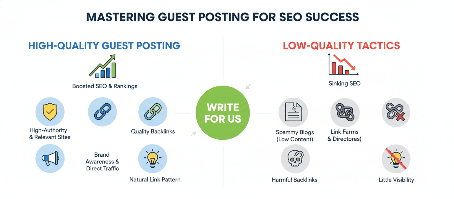 In my opinion, you can greatly boost SEO tactics, domain power, and rankings with “Write For Us” guest posting sites if you do it right. Do it with high-quality backlinks, on sites that are related to yours, and have authority in the industry. These super-efficient sites give you converts, can get people to visit your site directly every time, thereby strengthening brand awareness, and can provide authority backlinks regularly in a natural link pattern. and the SEO boosts may be offset by low-quality directories, link farms, and blogs that have little content. Choosing reputable sites in your niche, understanding audience fit, sticking to the submission rules, and using guest blog services, guarantees your backlinks will get you more online presence, visibility on your site, and long-lasting SEO, which positions your brand and content as a trusted authority in highly competitive markets.